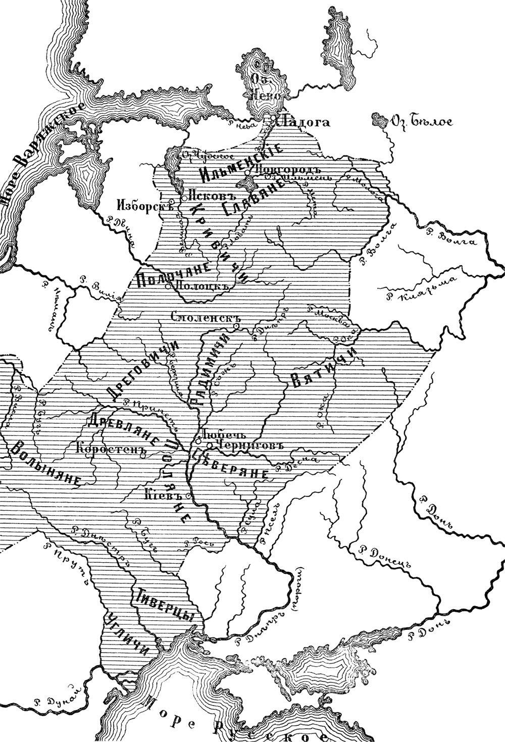 Их расселение. Начальная летопись не помнит времени прихода Славян из Азии в Европу; она застает их уже на Дунае. Из этой придунайской страны, которую составитель Повести знал под именем земли Угорской и Болгарской, славяне расселились в разные стороны; оттуда же вышли и те Славяне, которые поселились по Днепру, его притокам и далее к северу. Повесть приводит этих восточных Славян прямо с Дуная на Днепр и не помнит, чтобы они останавливались где-нибудь на этом пути. Рассказывая о расселении Славян, она различает две их ветви, западную и восточную. Славяне с Дуная расселились в разные стороны и назвались по именам мест, где поселились: одни поселились по реке Мораве и назвались Моравой, другие – Чехами. Это западные Славяне. Восточную ветвь составляли Хорваты Белые, Сербы и Хорутане; от этих Славян Повесть и производит те племена, которые заселяли Поднепровье. Она рассказывает, что когда Волохи, по мнению некоторых исследователей, Римляне при импер. Траяне, напали на Славян дунайских и начали их угнетать, эти восточные Славяне пришли на Днепр и стали называться одни Полянами, а другие Древлянами и т. д. Но византийские и латинские писатели VI и начала VII века, рассказывая о задунайских Славянах, племенное имя которых (Sclabo) появляется в византийских известиях с конца V века, дают понять, что восточные Славяне не прямо пришли с Дуная на Днепр. Эти писатели разделяют Славян на две главные ветви: на Антов, живших по Черноморскому прибрежью от нижнего Днестра до нижнего Днепра, и на Славян собственно, которые жили к северу от Дуная до верхней Вислы и к востоку до Днестра. Так именно определяет границы расселения славян латинский писатель VI века, хорошо знакомый с миром задунайских варваров и сам варвар, родом с нижнего Дуная, Иорнанд, историк Готов. Значит, Славяне, собственно, занимали тогда Карпатский край. Карпаты были общеславянским гнездом, из которого впоследствии Славяне разошлись в разные стороны. Эти карпатские Славяне в продолжение всего VI века громили Империю, переходя за Дунай; следствием этих постоянных вторжений, начало которых относят еще к III веку, и было постепенное заселение Балканского полуострова Славянами. Итак, прежде чем восточные Славяне попали с Дуная на Днепр, они долго оставались на Карпатах; здесь была их промежуточная стоянка. Одно из восточнославянских племен, Хорватов, знает на склонах Карпат, в Галиции, и наша начальная летопись даже в X веке, при кн. Олеге. Продолжительный вооруженный напор карпатских Славян в Империю соединял их в военные союзы. Мы находим следы одного такого союза, в состав которого входили именно восточные Славяне. Повесть о начале Русской земли составлена, очевидно, в Киеве; автор ее с особенным сочувствием относится к киевским Полянам, да и знает о них больше, чем о других племенах восточных Славян. Он передает ряд вражеских нашествий, испытанных этими Славянами, говорит о Болгарах, Обрах, Уграх, Хозарах; но до Хозар он не помнит о судьбе своих Полян. Народные потоки, прошедшие по южной России и часто дававшие больно чувствовать себя восточным Славянам, как будто ничем не задели восточнославянского племени, ближе всех к ним жившего, Полян. В памяти киевского повествователя XI в. уцелело от тех времен предание только об одном восточном славянском племени, но таком, которое в X в. не играло зам