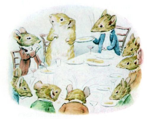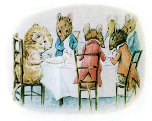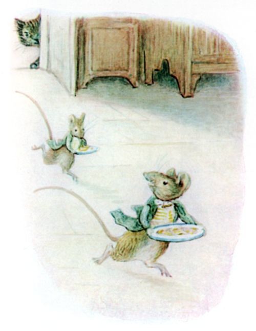 "Why don't those youngsters come back with the dessert?" It should be explained that two young mice, who were waiting on the others, went skirmishing upstairs to the kitchen between courses. Several times they had come tumbling in, squeaking and laughing; Timmy Willie learnt with horror that they were being chased by the cat. His appetite failed, he felt faint. "Try some jelly?" said Johnny Town-mouse.