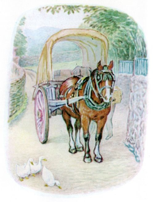 He awoke in a fright, while the hamper was being lifted into the carrier's cart. Then there was a jolting, and a clattering of horse's feet; other packages were thrown in; for miles and miles—jolt—jolt—jolt! and Timmy Willie trembled amongst the jumbled up vegetables.