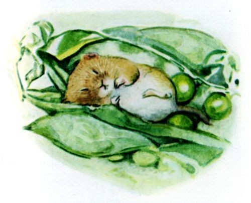 The gardener left the hamper by the garden gate, so that the carrier could pick it up when he passed. Timmy Willie crept in through a hole in the wicker-work, and after eating some peas—Timmy Willie fell fast asleep.