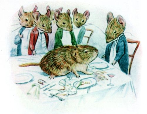 "Why don't those youngsters come back with the dessert?" It should be explained that two young mice, who were waiting on the others, went skirmishing upstairs to the kitchen between courses. Several times they had come tumbling in, squeaking and laughing; Timmy Willie learnt with horror that they were being chased by the cat. His appetite failed, he felt faint. "Try some jelly?" said Johnny Town-mouse.