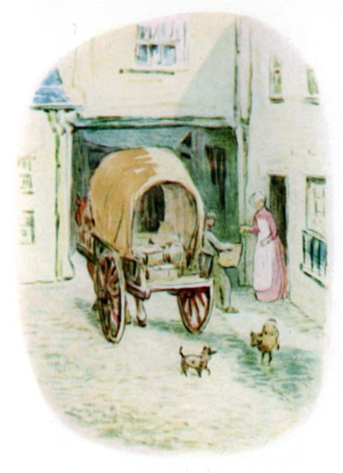 He awoke in a fright, while the hamper was being lifted into the carrier's cart. Then there was a jolting, and a clattering of horse's feet; other packages were thrown in; for miles and miles—jolt—jolt—jolt! and Timmy Willie trembled amongst the jumbled up vegetables.