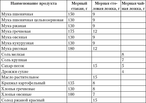 В комплект многих хлебопечек входят мерный стакан (240 г) и мерная ложка (столовая и чайная, 15 и 5 г соответственно). Однако обращаем ваше внимание на то, что у хлебопечек разных моделей мерные стаканы могут различаться (посмотрите инструкцию своей хлебопечки).