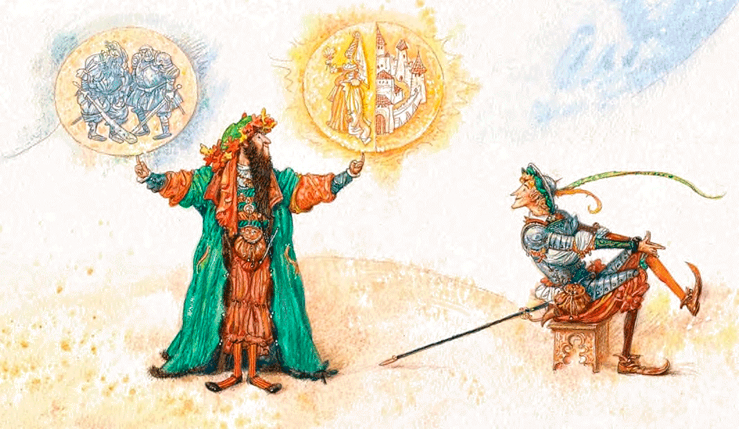 — Ладно, великанов я одолею. А твоей сотни всадников мне, пожалуй, и не надобно; кто семерых одним махом побивает, тому двоих бояться нечего.