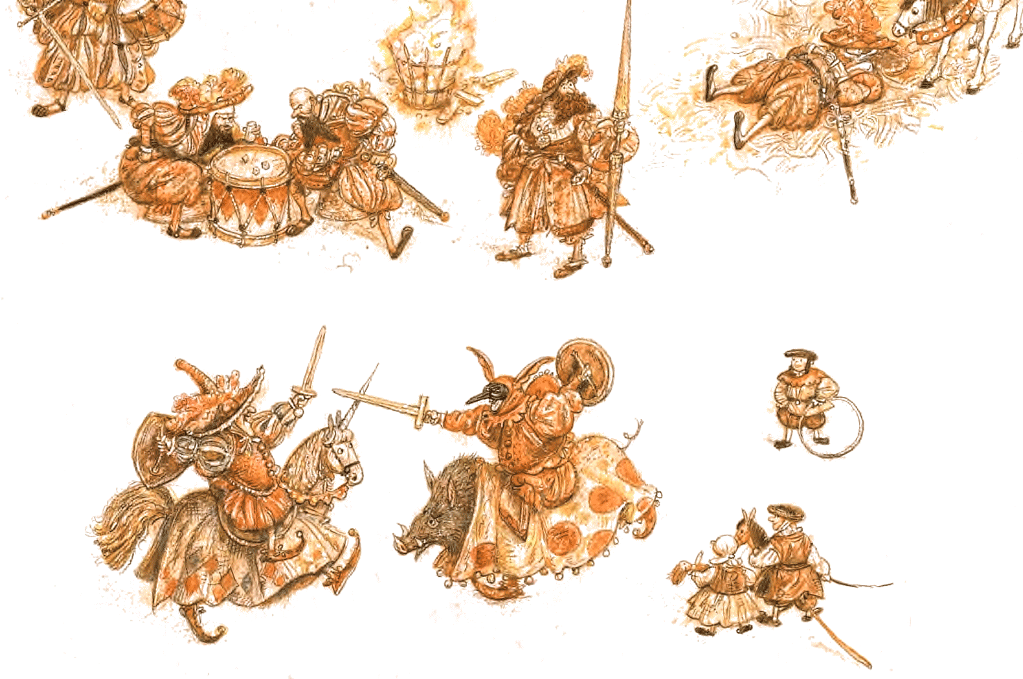 И вот портняжка пустился в поход, а сотня всадников за ним. На опушке леса, где жили великаны, он сказал своим спутникам:
