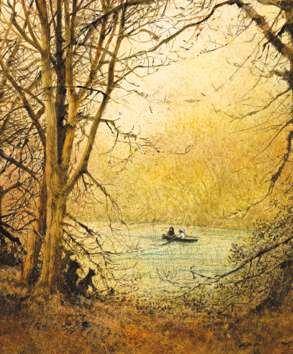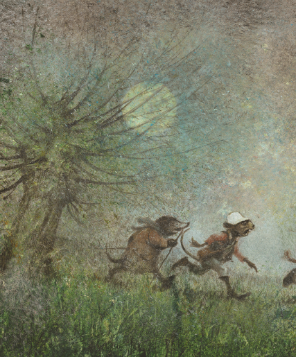 Уйдя со стрежня, они прошли в озерцо, на первый взгляд с рекой не связанное. Его отлогие берега покрывала зелёная трава, под водой извивались тёмные корни деревьев, а чуть поодаль стояла старая мельница, до самых стропил окутанная облаком серебристых брызг и пены, и в такт бесконечному движению колеса воздух звенел монотонным усыпляющим напевом, через который изредка прорезáлись чьи-то звонкие и чистые голоса. Крот мог только сложить передние лапы и восхищённо вздыхать.