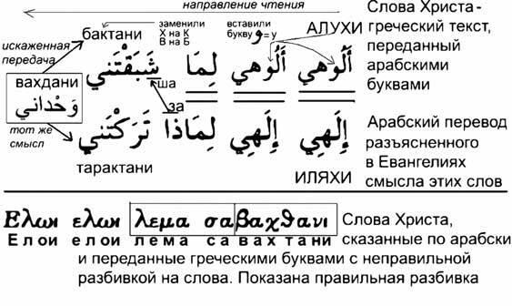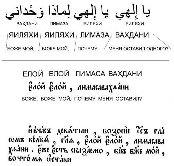 <<И в час девятый возопи Исус гласом велием, глаголя: “Елой, Елой, лимасавах<Ѳ>ани”, еже есть сказаемо “Боже, Боже мой, во что мя остави…”>> (Марк 15:34). Заметим, что церковнославянская буква «фита» может читаться как Ф или Т, а пишется очень похоже на Д. Получается, что слова Христа В ТОЧНОСТИ соответствуют арабскому выражению на египетском диалекте «Елла, Елла, лимаза вахдани», то есть «Боже, Боже, почему я [оставлен] один?»