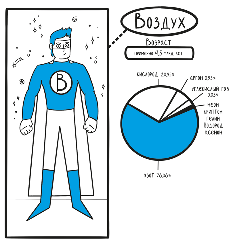 Первая часть «Что такое воздух», собственно, о том, что это такое и откуда он взялся. Его история, строение атмосферы, рассказ о каждом компоненте в отдельности — познавательно, но и не без юмора.