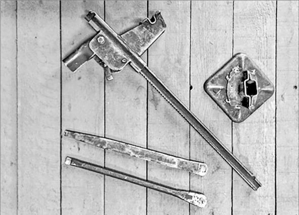 Достаю домкрат — москвичёвский, штатный. Достаточно своеобразная конструкция, прошу заметить. Это такая кованая прямозубая зубчатая рейка — длинная, сантиметров восемьдесят — некий уменьшенный советский аналог того типа домкратов, которые джиперы сейчас называют «хай-джеками». То есть зубчатая рейка, рычажок, который перещелкивает каретку вдоль этой зубчатой рейки, поднимая машину, опираясь на домкратную точку. Конструкция, честно говоря… ну, не самая удачная. Но по тем временам другой не было. Штатный домкрат. Москвич-2140. Ради интереса погуглите, посмотрите, что это за дивная железяка.