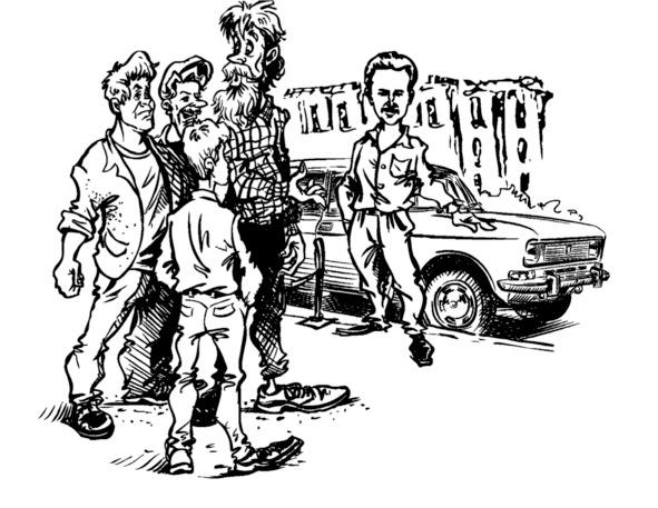 Бухающая публика поднимается с травки и, ведомая моим высокорослым бородатым пассажиром, движется в мою сторону. Причем по динамике их телодвижений намерения мужиков мною трактуются как явно недружелюбные. Подтягивается помаленьку вся эта троица с пьяным священником во главе — а покуда они подтягиваются, я их примерно ранжирую: двое вроде нестрашные — обычные работяги, лет по тридцать, не особо высокие, не особо плечистые и даже не особо агрессивные… Но есть предводитель: коренастый, в плечах пошире, настроен по виду решительно. Вот он-то как раз и идет первым.