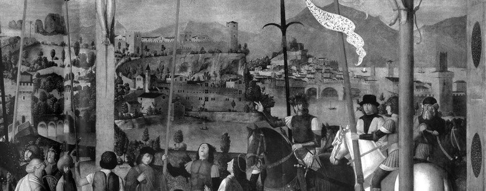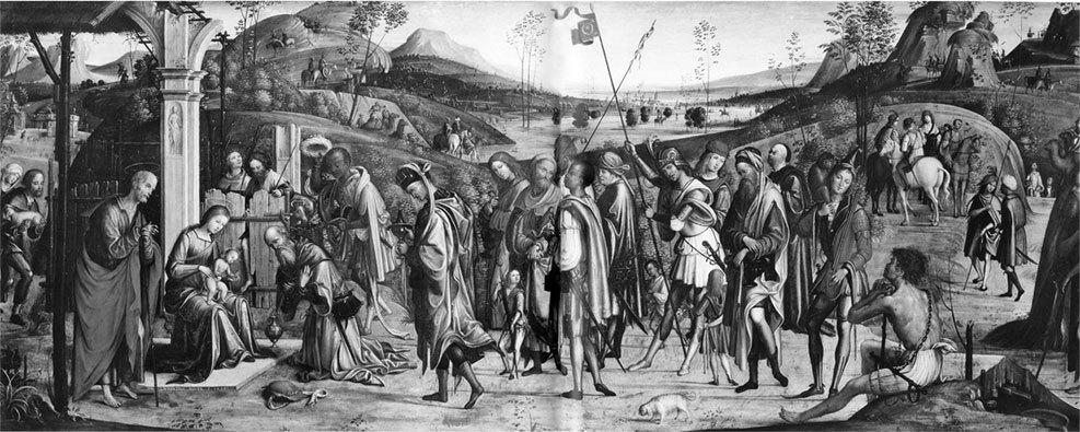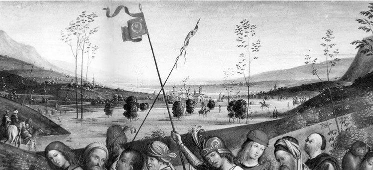 Рис. 12. «Поклонение волхвов». Фрагмент картины Лоренцо Коста Старшего (Lavrentivs Costa F.). Якобы 1499 год. На заднем плане – большая река. Взято из [463:1], с. 90–91, илл. 67.