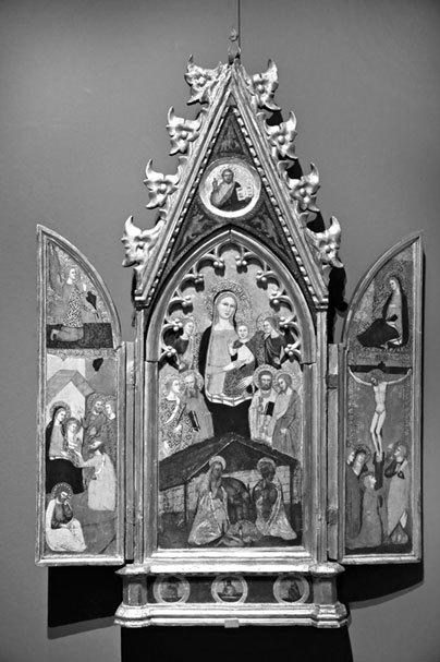 Рис. 16. Триптих, приписы-ваемый сегодня Андреа Бонаюти, прозванному Андреа да Фиренце (Andrea Bonaiuti, Andrea da Firenze). Якобы 1343–1377. Слева изображено Поклонение Волхвов. Музейная таблич-ка сообщает, что «в прошлом (триптих – Авт.) считался работой неизвестного флорентий-ского мастера… исполнен в мастерской Андреа Бонаюти». Музей изобрази-тельных искусств им. А. С. Пушкина. Москва. Фотография сделана А. Т. Фоменко в июне 2014 года.
