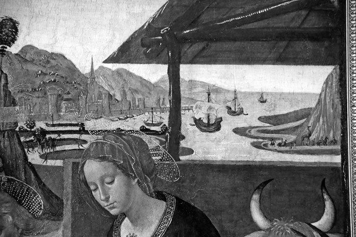 Аналогичная ситуация и с Вифлеемом. Сохранились старинные изображения, где Рождество Христово показано на фоне моря. Вот, например, картина «Рождество» Себастьяно (Бастиано) Майнарди, рис. 9. Показана каноническая сцена Рождества. Очень интересно, что, как считал Майнарди (и далеко не он один), Иисус Христос родился, как мы видим, на берегу моря. Это совершенно ясно видно из рис. 10 и рис. 11. По морю плывут корабли. Всё верно. Как мы обнаружили ранее, Христос родился на знаменитом крымском мысе Фиолент, на берегу Черного моря. Здесь до сих пор сохраняется старинный пещерный храм Рождества Христова.