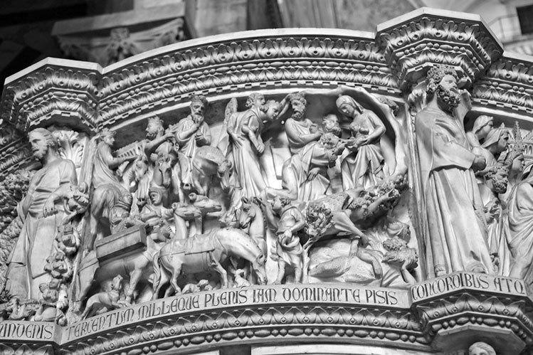 Рис. 36. Кафедра в Пизанском баптистерии. Наверху – серия барельефов.