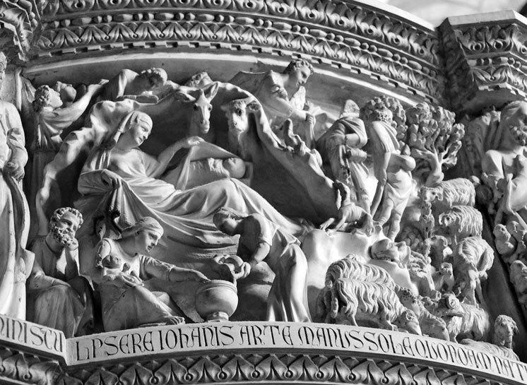 БАРЕЛЬФ РОЖДЕСТВА ХРИСТОВА. Стоит отметить, что на кафедре Пизанского собора изображено также Рождество Христово вместе с Поклонением нескольких Пастухов Младенцу Иисусу, рис. 33, рис. 34. Здесь тоже мы видим «мульфильм», развертку во времени. Двое Пастухов показаны справа вверху. Перед ними – Ангел, возвещающий Пастухам весть о Рождестве. Голова у скульптуры одного из этих Пастухов, к сожалению, отбита. Затем, уже слева, показано, как трое Пастухов явились на поклонение Иисусу. Они изображены тут над сводом пещеры, где находятся Мария, Младенец, Иосиф и служанки. Здесь трудно сказать, была ли среди этих Пастухов женщина. Таким образом, создатель кафедры – Джованни Пизано отразил оба евангельских рассказа. А именно, Поклонение Волхвов (из Матфея) и Поклонение Пастухов (из Луки), уже не понимая, что на самом деле это – одна и та же история. Забыл (приказали забыть).