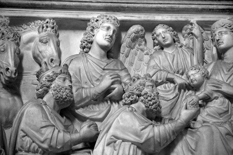 Этот пизанский барельеф интересен еще одним обстоятельством. Женщину Мельхиор обнимает одной рукой ангел с крыльями. Одна его рука обхватывает Мельхиор сзади, а другая рука возложена на голову Валтасара. При этом, Мария, Иисус и Иосиф показаны внутри пещеры. Надо сказать, мы впервые увидели сцену Поклонения Волхвов, где ангел как бы обнимает одновременно Мельхиор и Валтасара. На самом деле здесь всё понятно. Мы неоднократно сталкивались с тем, что на многих старинных изображениях Валтасар и Мельхиор выделены, «объединены» тем или иным способом. В частности, обычно стоят рядом. Например, на Кельнском саркофаге Волхвов, рис. 15, Валтасар и Мельхиор охвачены одной аркой, чем, очевидно, подчеркивается их родство, близость. Скорее всего, указывали на тот факт, что Малка-Мельхиор была матерью Владимира-Валтасара. Они были родственниками. А Каспар, вероятно, их родственником не был. Поэтому его изображали отдельно, в другой позе, не под одной аркой с Мельхиор и Валтасаром. В случае с пизанской кафедрой, Джованни Пизано объединил и выделил пару – Мельхиор-Валтасар тем, что изобразил ангела, обнимающего этих двух Волхвов. А вот Каспара ангел не обнял.