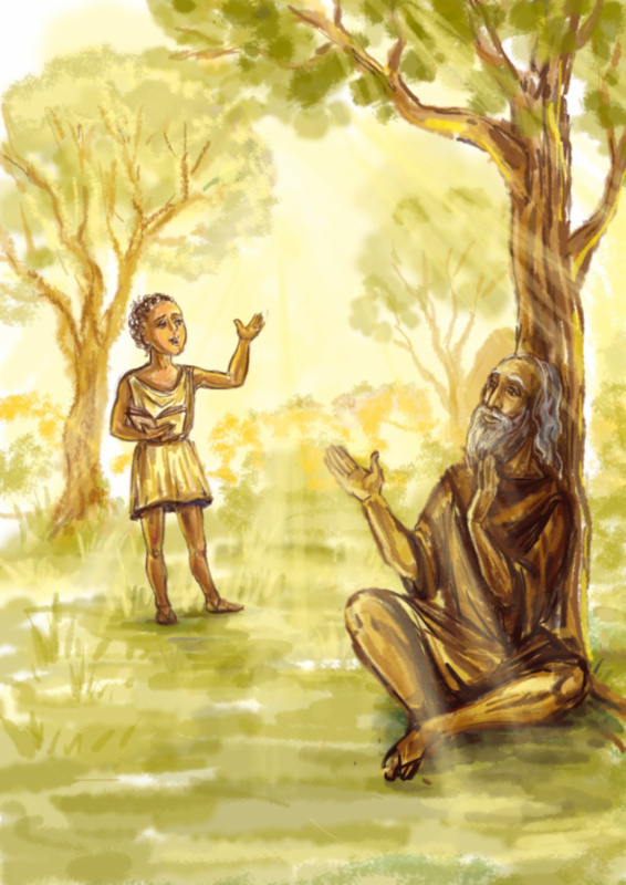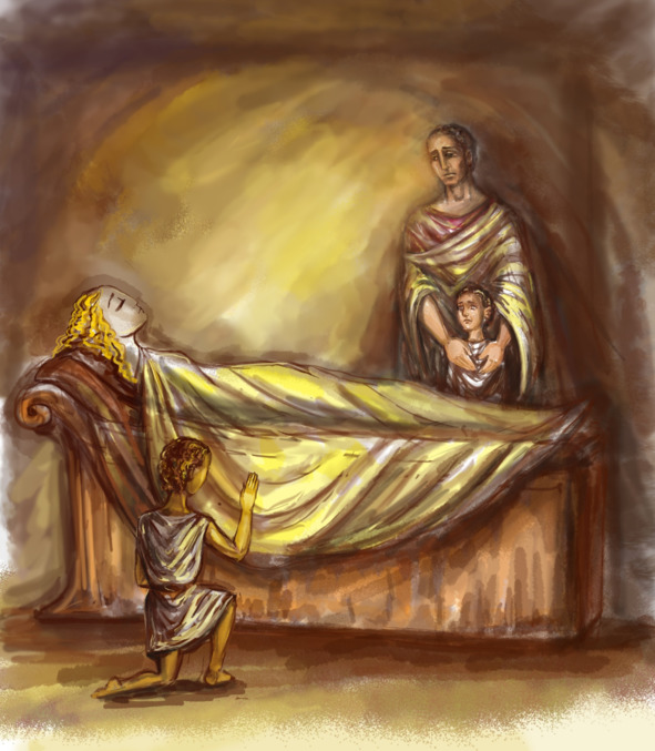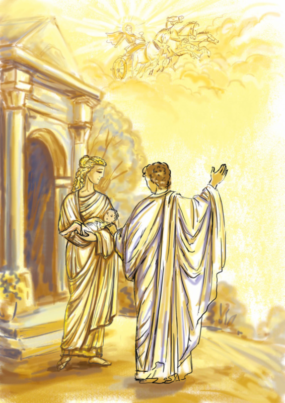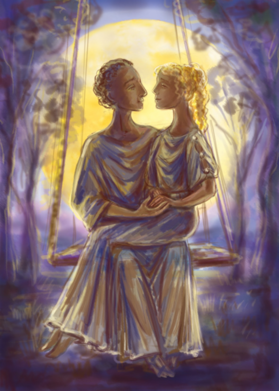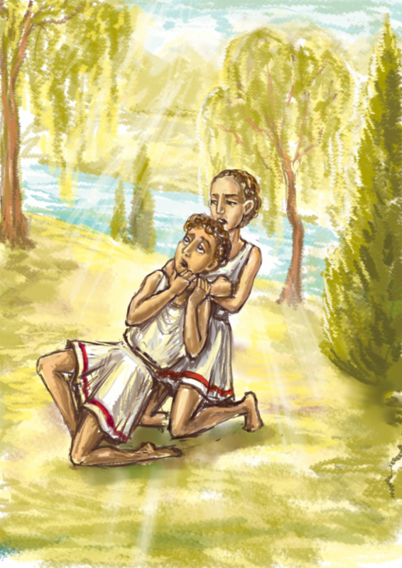 Сколько они целовались, они не знали, бог времени Хронос просто забыл о них. Очнулись они от окрика родителей, которые их потеряли. Когда дети вошли в триклиний, вид у них был смущенный: их губы горели от поцелуев, и им казалось, что это видят все.