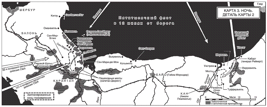 Операция «Оверлорд» (высадка союзных войск в Европе) началась в ноль часов пятнадцать минут 6 июня 1944 года, который навсегда войдет в историю как день «D». В ноль пятнадцать отряды специально отобранных десантников из 101-й и 82-й воздушно-десантных дивизий США покинули доставившие их самолеты и вступили на освещенную лунным светом землю Нормандии. Пять минут спустя в 50 милях[1] от них высадились десантники из 6-й британской воздушно-десантной дивизии. Это был головной отряд, в задачу которого входило обеспечение последующей высадки парашютистов и планеров с пехотой.