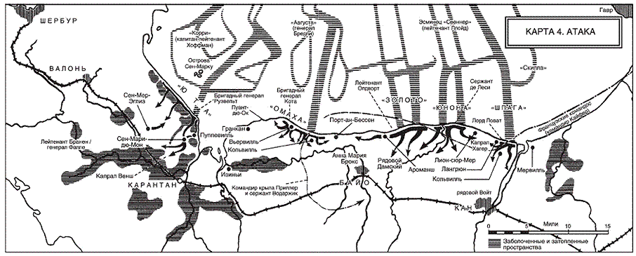 Воздушно-десантным войскам союзников предстояло захватить и удержать объекты до высадки морского десанта на нормандском побережье в районе пяти плацдармов: «Юта», «Омаха», «Золото», «Юнона» и «Шпага». Пока парашютисты вели ночные бои, самая большая в мировой истории армада кораблей приблизилась к плацдармам – почти пять тысяч кораблей, на которых находилось свыше двухсот тысяч солдат, матросов и морских пограничников. В первой волне морского десанта, который вышел на берег в шесть тридцать утра, участвовало несколько тысяч человек. Действия десанта поддерживала массированная бомбардировка авиации и морской артиллерии.