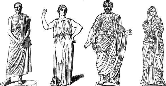 Слева направо: греческий мужчина в плаще (гиматии), греческая женщина в тунике (хитоне), римский мужчина в тоге и римская матрона в мантии (палле). Изображение из открытого доступа