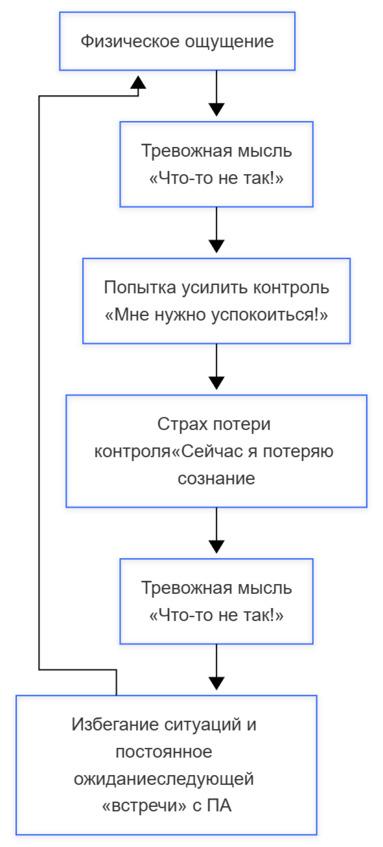Существует определенная цепочка, которая повторяется снова и снова: какое-то физическое ощущение (например, небольшой дискомфорт) → тревожная мысль («Что-то не так!») → попытка усилить контроль над своим телом («Мне нужно успокоиться!») → страх потери контроля («Сейчас я потеряю сознание!») → и, наконец, избегание ситуаций, которые могут спровоцировать атаку, и постоянное ожидание следующей «встречи» с паникой.