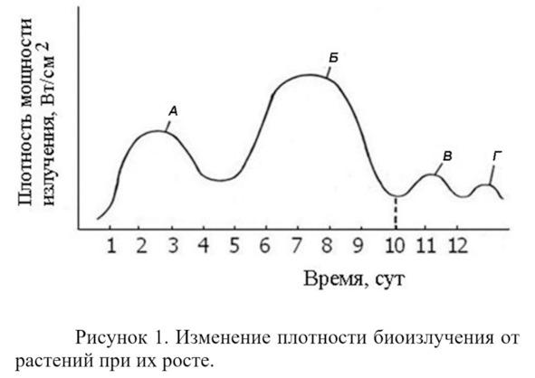 В патенте RU 2108028 авторов Котова Б.С и Гавинского Ю. В. (1996), приведены результаты измерений биологического излучения ростков различных растений в диапазоне длин волн от 2 мкм до 2 мм (Рис. 1). По одной оси указана плотность мощности излучения (Вт/см2), а по другой оси — возраст ростков в днях.