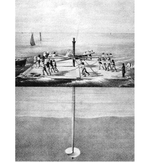 Монтаж свай был достаточно трудоемким — обычно свая устанавливалась на плотах и вкручивалась усилиями лошадей с использованием длинных рычагов.