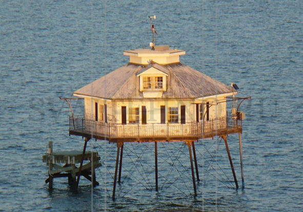 Подобный маяк был установлен в сходных условиях заливе Делавер Соединенных Штатов в 1850-х годах. Здесь впервые в качестве тела сваи были использованы не толстые бревна, а металлические трубы. Лопасти были приварены к трубам, что сообщало конструкциям дополнительную жесткость по сравнению с деревянными. В последующие десятилетия этот революционный метод установки маяков был широко применен по всей Америке. В период с 1860 по 1872 год данным способом было установлено 18 морских пирсов. Число маяков в Америке, построенных с помощью винтовых свай перевалило 100 до конца века.