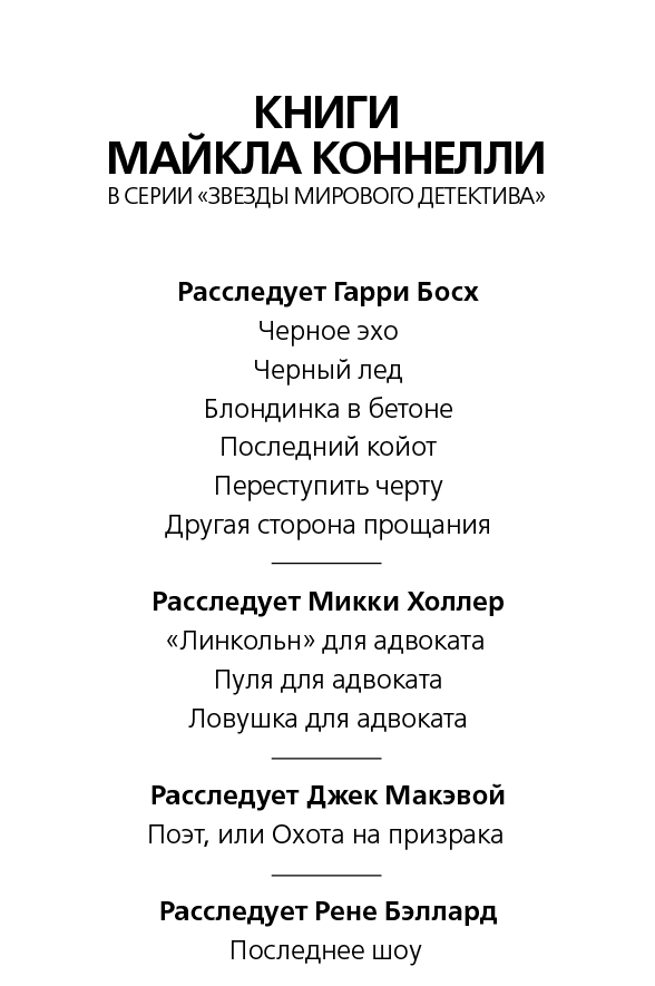 Босх некоторое время смотрел на табельный номер патрульного. Он знал, что номер 1906 принадлежал человеку, который теперь был одним из самых могущественных лиц в управлении. Помощнику начальника управления Ирвину Ирвингу. Когда-то Ирвинг признался Босху, что был знаком с Марджори Лоуи и что это он нашел ее убитой.