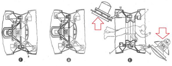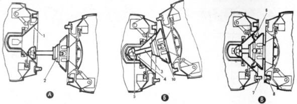 «Схема стыковки космических кораблей и модулей с орбитальной станцией „МИР“. На схеме показаны основные этапы стыковки: А — касание, Б — сцепка, В — стягивание». [2]