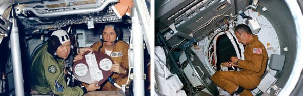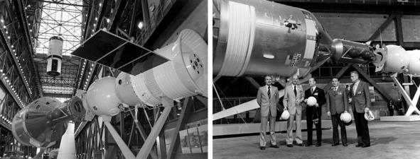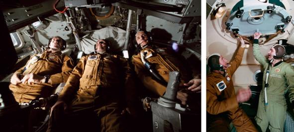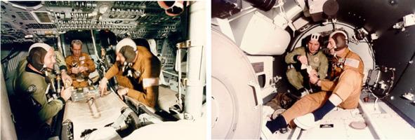 Снимки выше были местами предварительных съемок о полете, которого не было: Фотографии НАСА, слева, направо: S75—22751, S75—22832. Тренировки совместного полета не требовали совместных обедов. Но съемка «космического» полета до его реального осуществления, требовала создания таких эпизодов. Макеты этих объектов находились B Лаборатории моделирования космической среды, корпус 32, в космическом центре имени Джонсона. Такие же макеты находились в самолетах нулевой гравитации со времен «лунных полетов». В этих самолетах успешно снимались сцены невесомости. Наследие программы «полетов на Луну» пригодилось в последнем шоу «Аполлон».