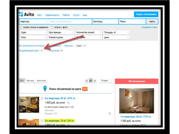 Нажимаем закладку снять квартиру «На длительный срок»;