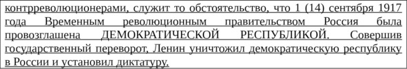 В октябре этого же года произошел государственный переворот и захват власти сравнительно малочисленной политической экстремистской партией большевиков. Это была контрреволюция, которую сам вожак большевиков поначалу так и называл — переворот. Но спохватился, и вскоре стал переворот именовать Великой Октябрьской социалистической революцией. Так было положено начало фальсификации политической истории России