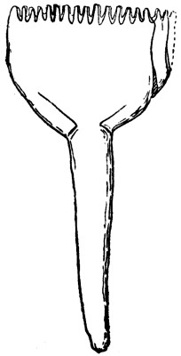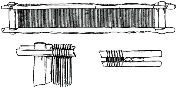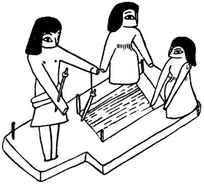 All the drawings but Wilkinson’s show the warp threads converging towards the breast beam; Wilkinson shows them parallel and in Lepsius their convergence is excessive. There should be a slight convergence shown, as in the course of weaving the threads get drawn in, and in later forms of looms in semi-civilised countries we find an endeavour to counteract this tendency by the use of a tool known as a “temple.”