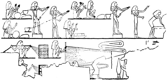 Of this illustration, there appear to be six reproductions. We have first of all, Fig. 1, that of Fred. Cailliaud (Recherches sur les Arts et Métiers, etc., Paris, 1831) with illustrations of drawings made by himself in the years 1819 to 1822. His publication was followed by Fig. 2, that of Sir J. G. Wilkinson (Manners and Customs, etc., London, 1837). Mr. John Murray, whose house has published Wilkinson’s work from the first edition to the last, informs me that a few of the drawings were made by George Scharf, afterwards Sir George Scharf, Keeper of the National Portrait Gallery, but that most of them seem to have been made by Joseph Bonomi, the well known Egyptologist. Wilkinson’s woodcut, although clearly and neatly done, is on a very small scale; nevertheless it admits of a fair comparison with those reproduced on a larger scale.