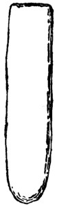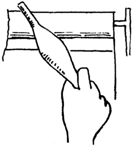 The breast beam:—It appears to me that the three portions marked G1, G2 and G3 joined up are intended to represent the breast beam and its holding pegs, similar to the warp beam A and its pegs B1, B2, but the portion K is not clearly drawn in any of the reproductions. Wilkinson omits this altogether, but in its place has two black pieces which also are still less clear. Lepsius has omitted G2 altogether and appears to have made G1 and K and G3 into treadles, by raising G1 above the level of G3, and to support the view that these are treadles, he makes use of the overseer’s foot by placing it on the supposed treadle, and the casual observer thinks it is the foot of the woman weaver. However, Mr. Davies’ copy seems to offer a solution. He agrees with Cailliaud and Rosellini in so far as G1, G2 and G3 are concerned. With him K takes quite a different form, in fact it looks very similar to an article which an attendant woman in another panel has close by her, see Fig. 8. It might perhaps be a rest to prevent the beater-in being driven home too forcibly—this, however, is still only a surmise—as the length of the beater-in makes it heavy at the far end.