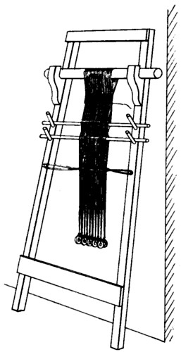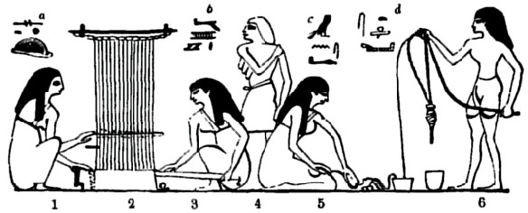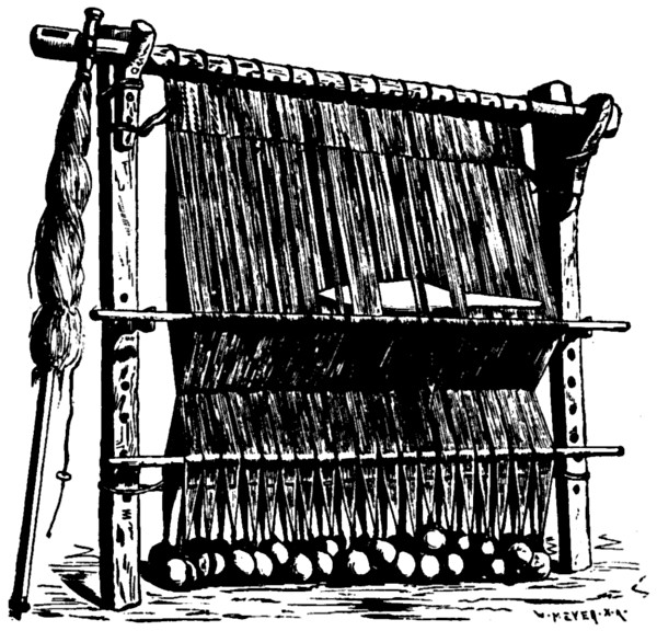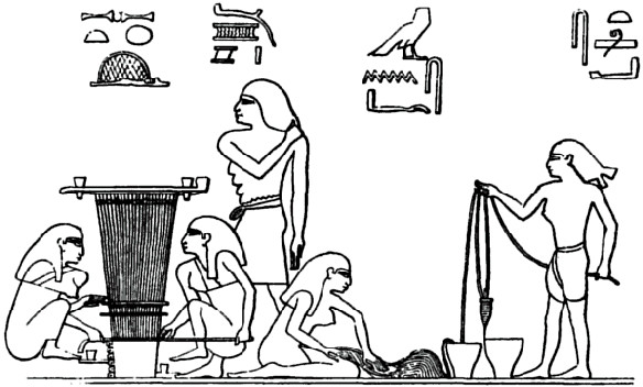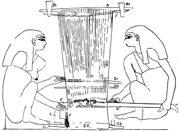 IN the tomb of Chnem-hotep, at Beni Hasan, there is a wall painting of a horizontal loom with two weavers, women, squatting on either side, and at the right in the background is drawn the figure of the taskmaster. There are also figures represented in the act of spinning, etc. For the present we are concerned with the weaving only.