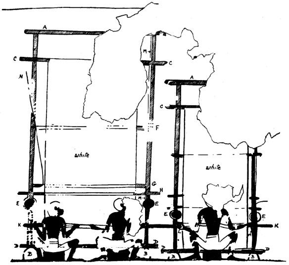 “The larger loom is worked by two men, the smaller by one man only. The looms consist of an oblong frame A set up on two stones B. The warp is attached to the warp beam C on top and the breast beam D at the bottom. The threads of the warp are not shown, no difference being made between any woven part and the warp threads; to all is given one smear of white paint. Two discs E are seen hanging against the frame posts, one on each side, the earlier sketch showing a larger disc than the final drawing in dark red.