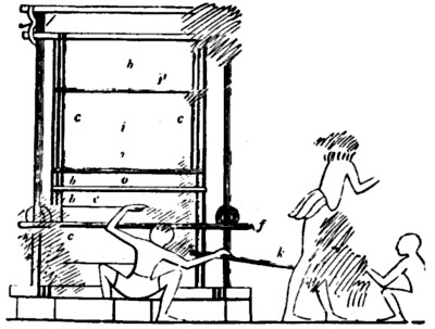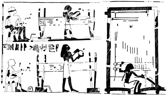 Upright or Vertical Looms from the Tomb of Thot-nefer at Thebes, XVIII. Dynasty, circa B.C. 1425. From a drawing by Mr. N. de G. Davies. Size of original: Height from Base Line to top of frame at A, 11½" = 29 cm.