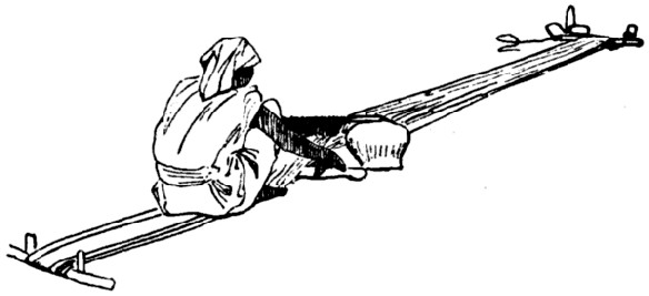 There is no very clear evidence as to how the finished cloth was “taken up” unless we accept it that the bulging out of the part G2 means that it was wound round the breast beam as is done on hand and power looms of the present day. Some very long pieces of cloth have come down to us and unless they were “taken up” in this way a long stretch of ground would have been necessary. A modified form of this horizontal loom has been met with in recent years among the Bedawin Arabs, as shown in the illustration of a study sketch, Fig. 12, made by Frank Goodall, R.A., in the forties of last century. The loom was provided with pegs like the old Egyptian loom but it was supplied with a primitive heddle resting on a stone at each side of the warp and it would appear that the weaver, to a certain extent, did not take up the woven cloth by winding it round the breast beam and by that means retaining his position, but, as the weaving progressed and the line of finished cloth got beyond his reach, he crept up to it and so got farther and farther away from the breast beam until in the end he arrived at the warp beam. Similar looms are still used for mat making by the Egyptian fellah.