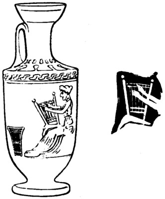 Fig. 15.—Greek loom with spool and warp weights. Illustration on a skyphos (van Branteghem vase in the Ashmolean Museum, Oxford). From H. B. Walters’ paper on Odysseus & Kirke on a Boeotian vase, Jour. Hellenic Studies, 1892-3 XIII. p. 81.