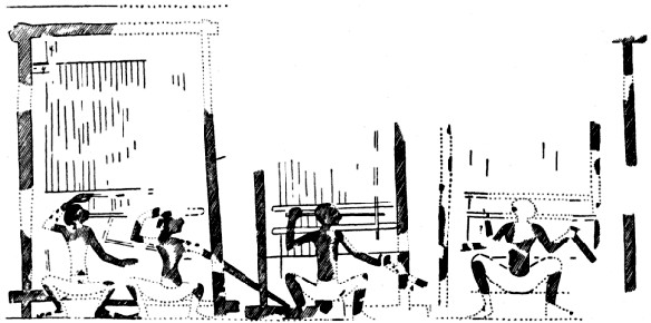 Fig. 16B.—Weavers at work as represented in the Tomb of Nefer-ronpet, Superintendent of Weavers at Thebes. Date about 1200 B.C. From a drawing by Mr. N. de G. Davies.
