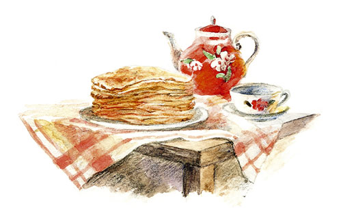 И вот, наскоро проглотив тарелку супа, я сижу напротив сестры за столом, и мы за обе щеки уплетаем тонкие, все в дырочках, будто кружево, бабушкины блины. Она печёт их на двух сковородках, стоящих на керосинках. Огоньки тепло мерцают сквозь их слюдяные окошечки. Смазанные маслом из бидончика, блины восхитительно пахнут и блестят.