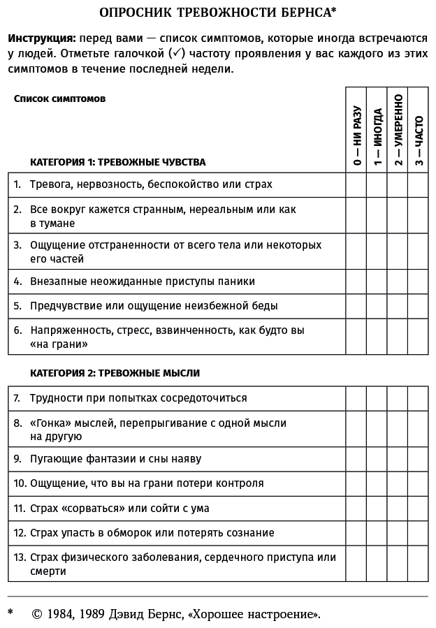 Чтобы помочь вам определить, страдаете ли вы от депрессии или тревожности, я разработал два теста настроения: опросник тревоги Бернса и опросник депрессии Бернса. Представьте, что это эмоциональные «градусники», которые показывают, есть ли у вас эмоциональная «температура». Вы можете заполнить и интерпретировать любой из этих опросников в течение двух минут. Я хочу, чтобы вы делали оба теста еженедельно, чтобы отслеживать свой прогресс в ходе чтения этой книги. Если вы проходите психотерапию, вы можете каждую неделю показывать результаты своему психотерапевту, как поступают пациенты в моей клинике. Когда показатели пойдут вниз, у вас будет доказательство улучшения вашего состояния. А когда показатели по каждому тесту не будут превышать 4 баллов, вы будете чувствовать себя превосходно.