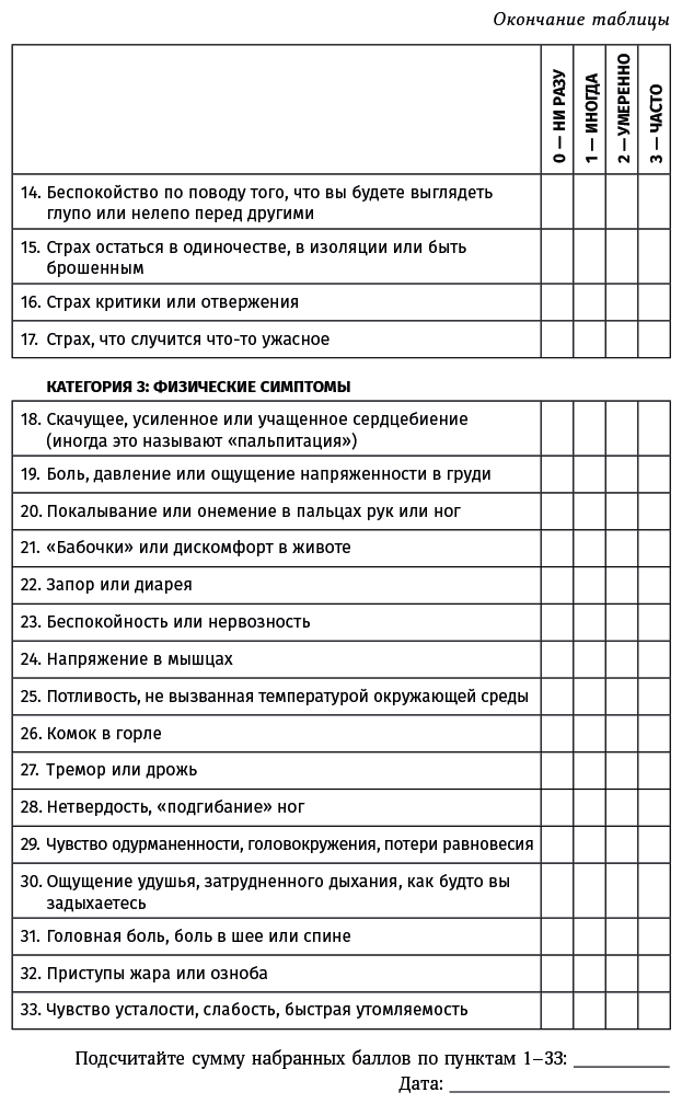 В опроснике тревожности Бернса (BAI) перечислены 33 распространенных симптома тревоги. Заполните этот опросник прямо сейчас. Вам просто нужно отметить в одном из окошек справа, насколько каждый из симптомов беспокоил вас в течение последней недели. Поставьте 0 баллов, если он ни разу вас не беспокоил, 1 балл — если беспокоил иногда, 2 балла — умеренно, 3 — часто.