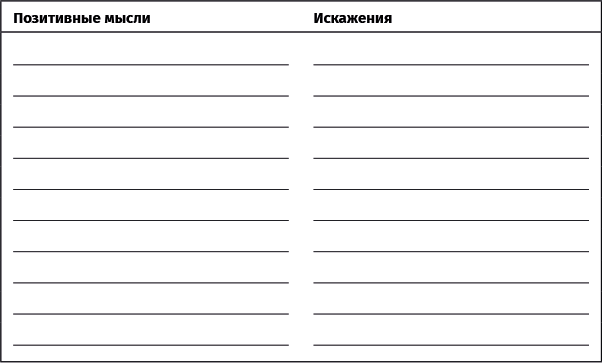 Можете ли вы вспомнить, какие «позитивные» мысли приходят вам в голову, когда вы сталкиваетесь с этим искушением? Запишите их в левой колонке и пронумеруйте. Затем попытайтесь найти в них искажения и выпишите их в правую колонку: