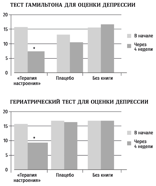 Рис. 1. Результаты теста Гамильтона для оценки депрессии и гериатрической шкалы депрессии у всех пациентов при первичном измерении и четыре недели спустя. Более высокий балл означает более тяжелый уровень депрессии. Как можно заметить, состояние пациентов, получивших экземпляр «Терапии настроения», значительно улучшилось, в отличие от пациентов, читавших книгу-плацебо и пациентов в списке ожидания (не получивших никакую книгу). *p < 0,05