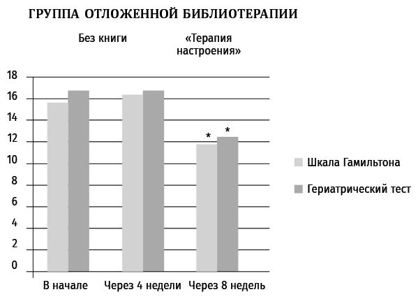 Остальным пациентам сказали, что они помещены в список ожидания на четыре недели до начала лечения. Вторую группу — контрольную — назвали «группа отложенной библиотерапии»: им выдали «Терапию настроения» только через четыре недели. Это было необходимо для того, чтобы понять, что улучшение состояния пациентов в группе немедленной библиотерапии произошло не само собой, просто с течением времени.