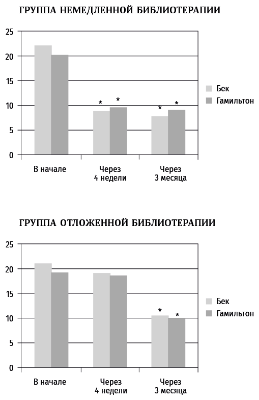 По прошествии четырех недель две группы сравнили. Как показано на рис. 3, состояние пациентов из группы немедленной библиотерапии значительно улучшилось. Средний показатель обоих тестов был около 10 или ниже — как считается, в пределах нормы. Эти изменения в уровне выраженности депрессии рассматриваются как значимые — статистически и клинически. Также видно, что результат этих пациентов сохранялся в течение последующих трех месяцев, и у них не было рецидивов. После завершения «лечения» даже отмечалась тенденция к дальнейшему улучшению состояния. Показатели уровня депрессии при повторном тесте через три месяца были еще ниже.