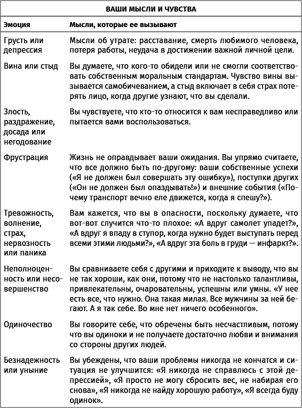 Давайте подытожим основные идеи этой главы. Во-первых, вы узнали, что настроение создается мыслями, а не внешними событиями. Во-вторых, вы узнали, что определенные типы негативных мыслей порождают определенные виды негативных эмоций. Например, убеждение, что вы находитесь в опасности, вызовет у вас тревогу или страх. В-третьих, вы узнали, что негативные мысли, которые ведут к депрессии, тревожности, чувству вины, злости и фрустрации, зачастую искажены и не соответствуют действительности, даже если кажутся вам абсолютной истиной. Осознание ключевых связей между мыслями и эмоциями — первый шаг к тому, чтобы вырваться из плохого настроения. Нижеприведенное упражнение поможет вам лучше осознать, какие искаженные мысли чаще всего связаны с различными отрицательными чувствами, такими как злость, тревожность, стресс и депрессия, а также с вредными привычками, например алкоголизмом.